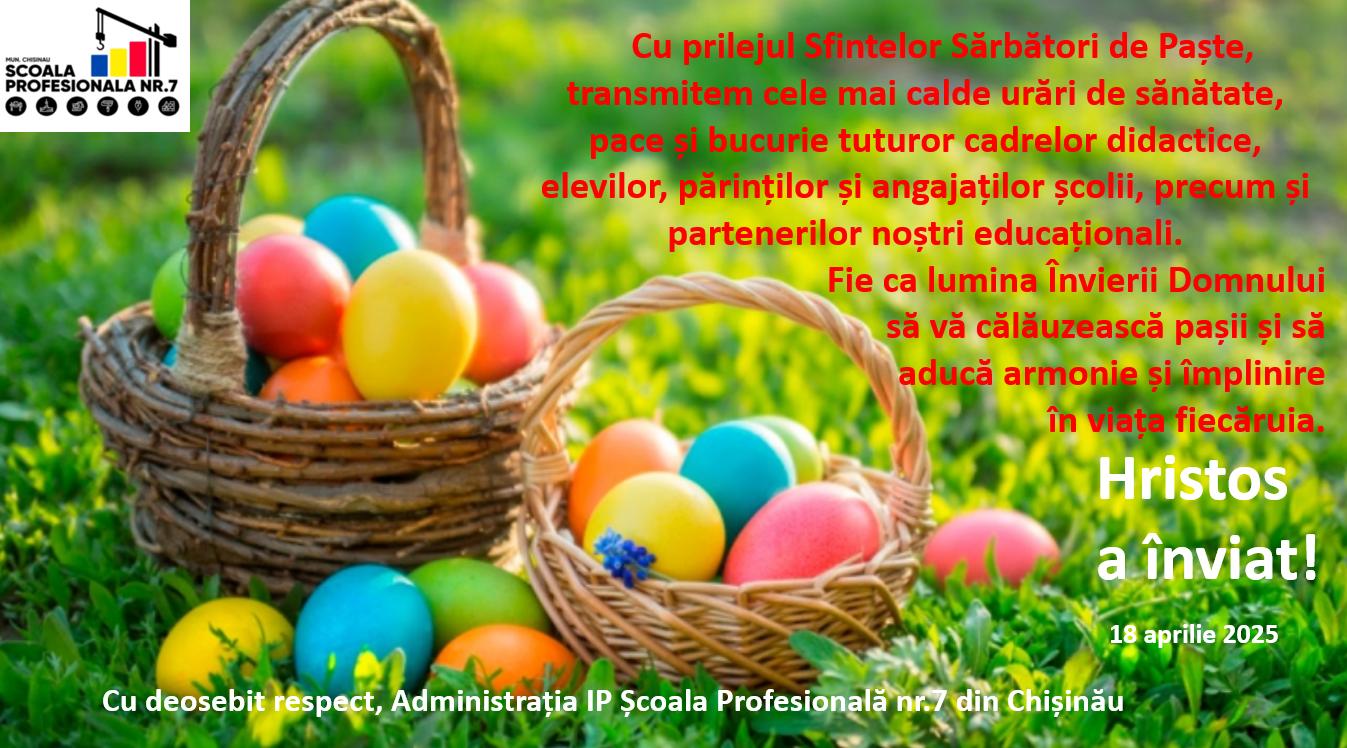 Cu ocazia Sfintelor Sărbători de Paște, vă dorim din suflet ca lumina și pacea acestei sărbători să vă aducă sănătate, bucurie și liniște sufletească.