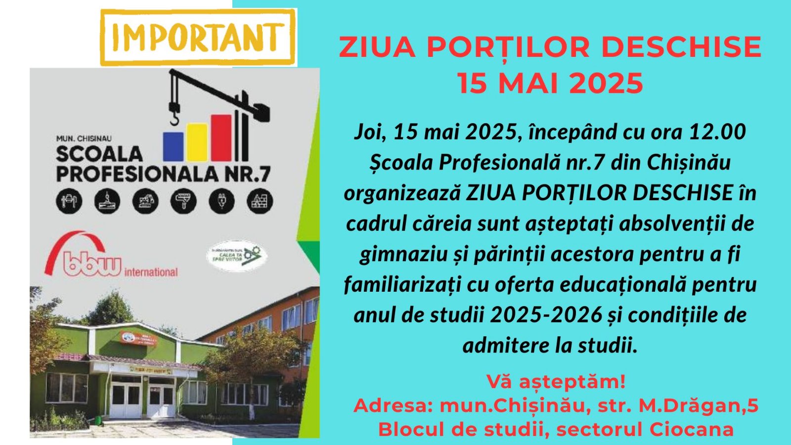 📢 ANUNȚ- Ziua Porților Deschise la Școala Profesională nr. 7 din Chișinău!